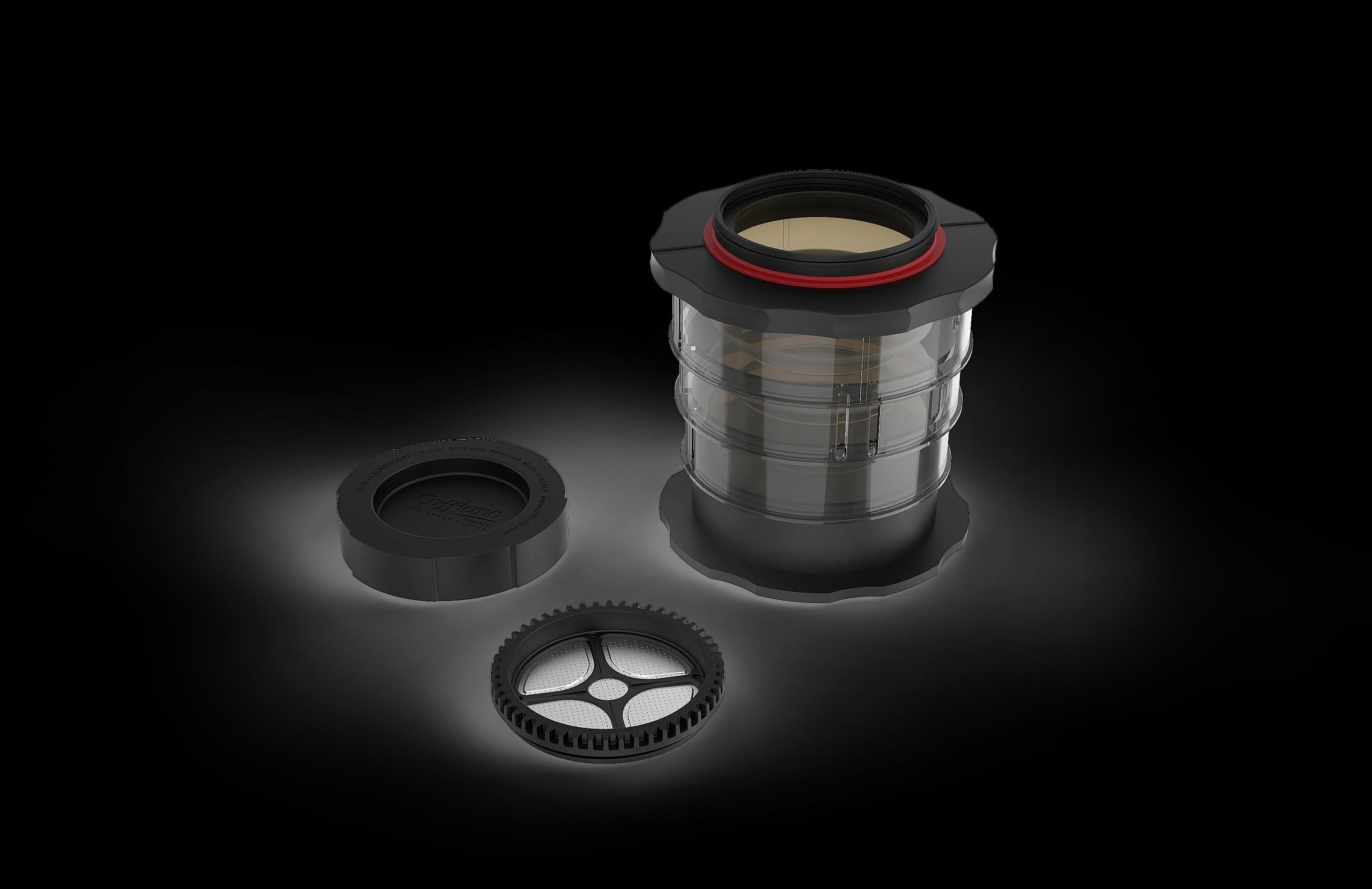 Cafflano® Kompact est un infuseur à café avancé, composé d'une chambre à soufflet en silicone (chambre de presse à transmission de puissance facile et efficace) avec un guide de presse pliable, un micro-filtre en acier inoxydable gravé ultra-fin et un sas pour le garder compact et pour permettre une infusion à froid en déplacement.
